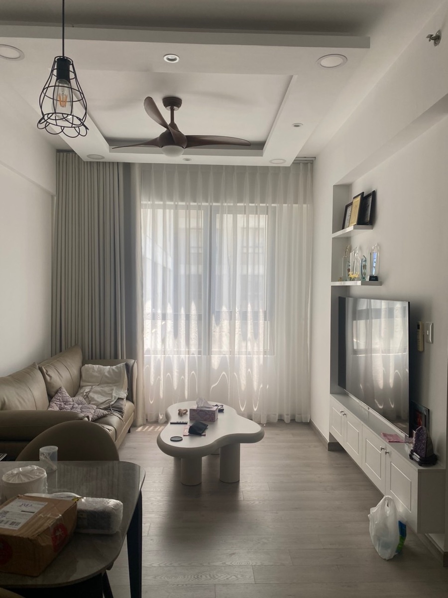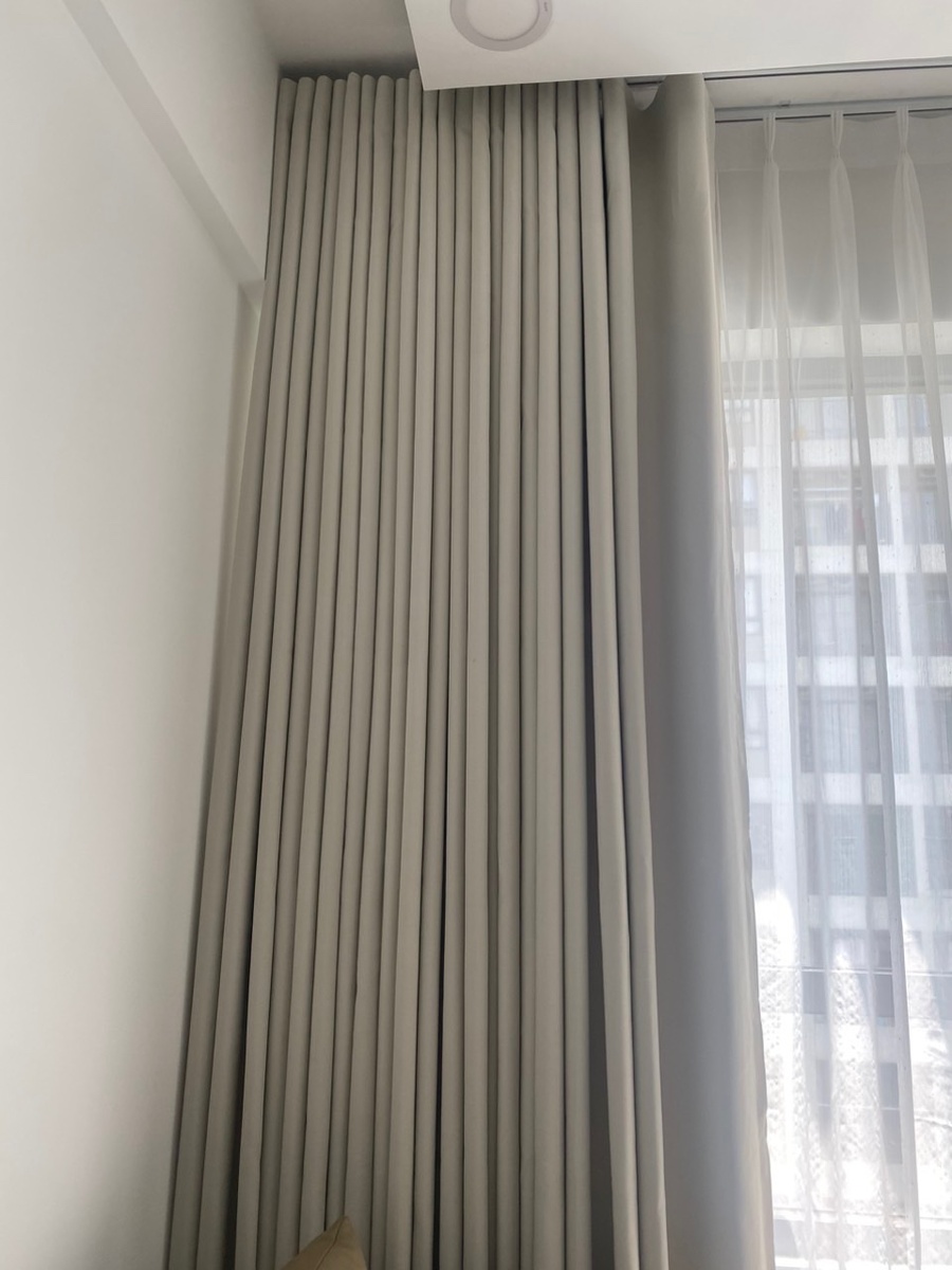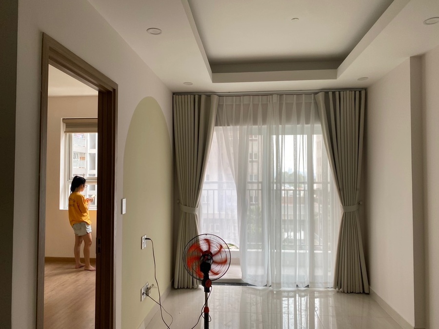 - Loại rèm lắp đặt: Rèm vải 2 lớp màu kem và rèm cầu vồng