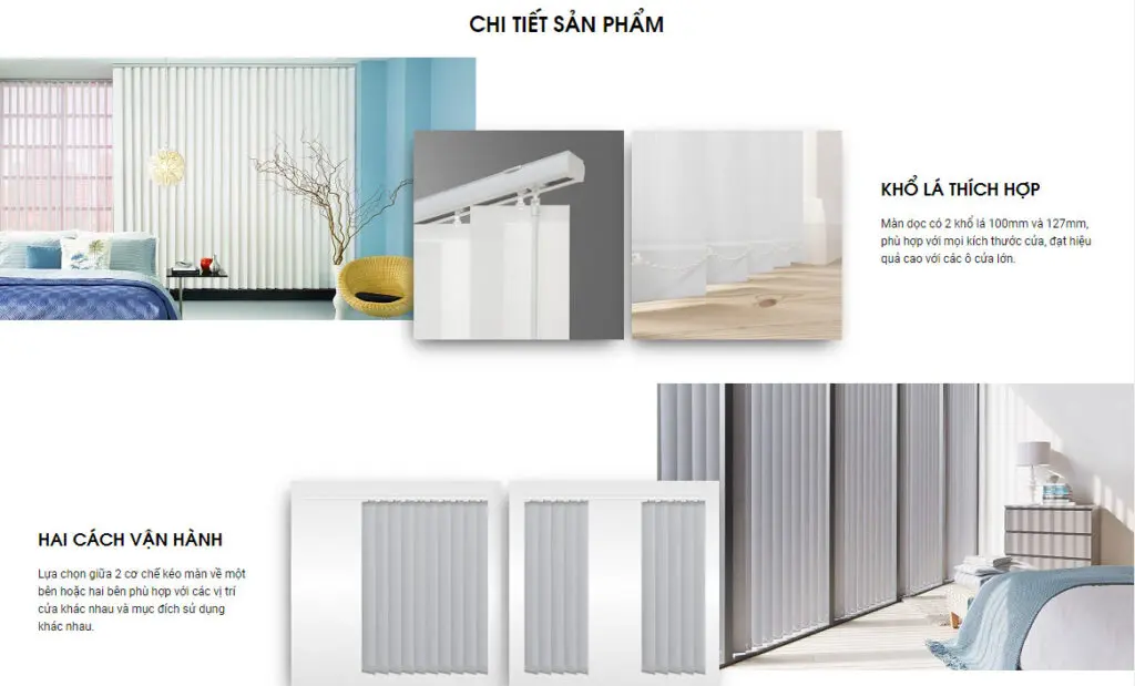 ✔ Khổ lá thích hợp: Màn dọc có 2 khổ lá 100mm và 127mm, phù hợp với mọi kích thước cửa, đạt hiệu quả cao với các ô cửa lớn.