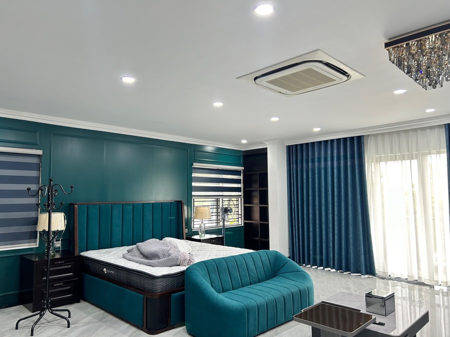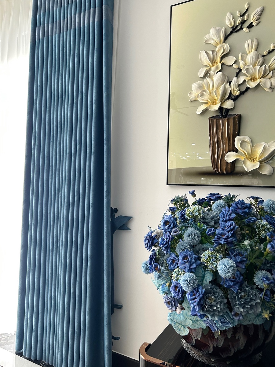 Rèm vải 2 lớp màu xanh cobalt mang đến vẻ đẹp tinh tế và thanh lịch, làm nổi bật không gian của biệt thự. Lớp vải ngoài cùng tạo sự mềm mại, trong khi lớp vải lót bên trong giúp kiểm soát ánh sáng, tăng cường khả năng cách nhiệt và chống ồn. Đặc biệt, màu xanh cobalt không chỉ mang lại cảm giác sang trọng mà còn dễ dàng phối hợp với các thiết kế nội thất khác nhau.
